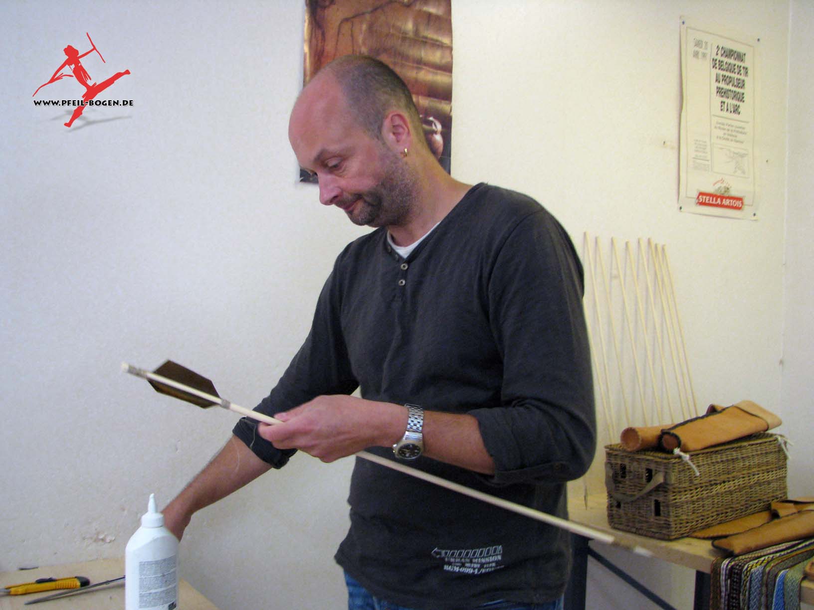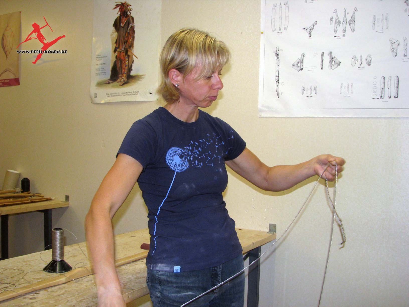 Steinzeitbogen, zwirnt die eigene Bogensehne und fertigt passende Pfeile