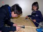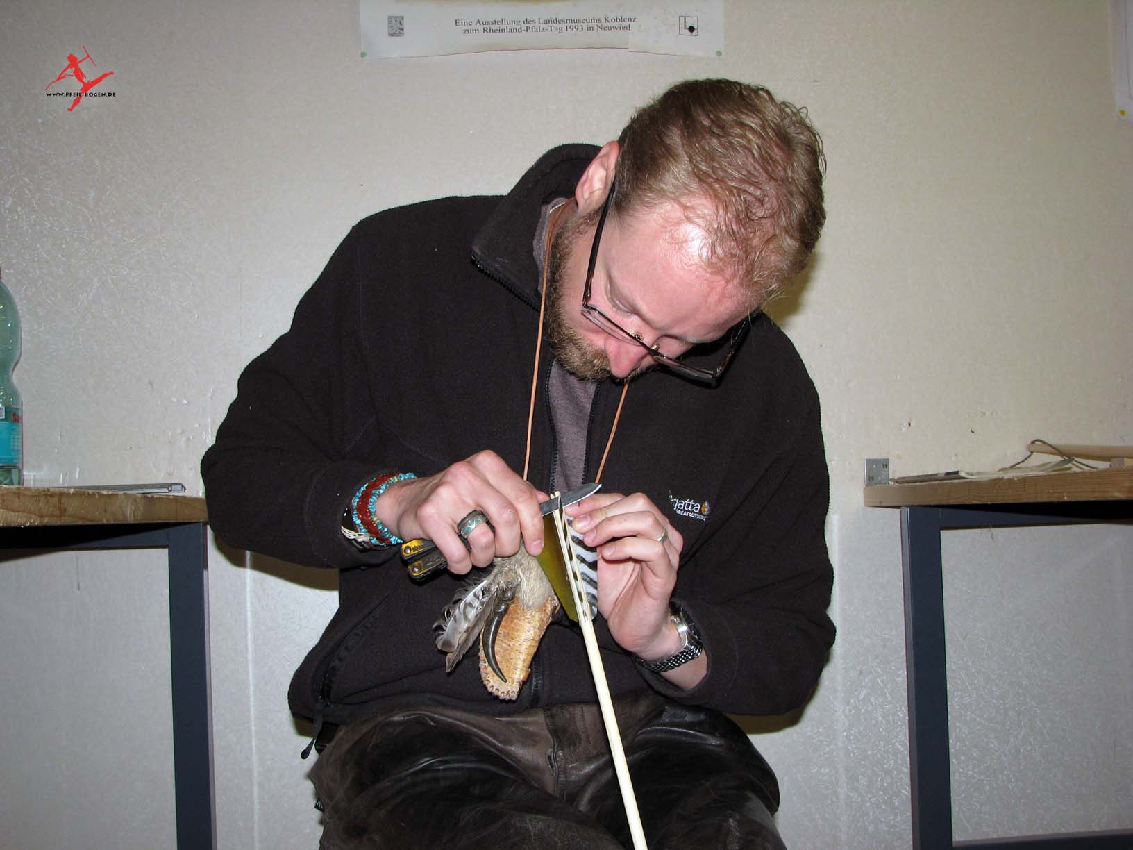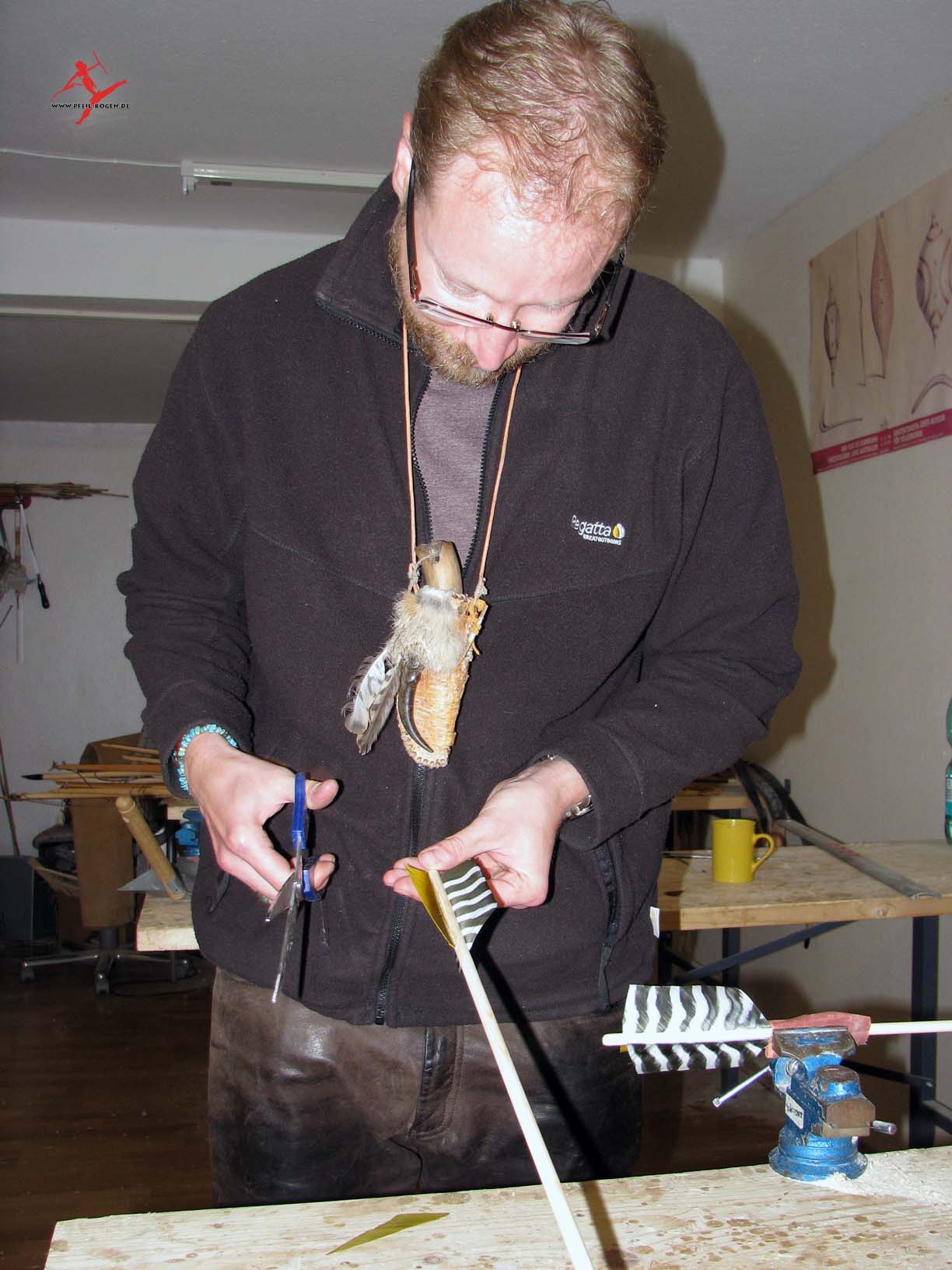 Steinzeitbogen, zwirnt die eigene Bogensehne und fertigt passende Pfeile