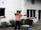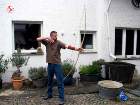 Steinzeitbogen, zwirnt die eigene Bogensehne und fertigt passende Pfeile
