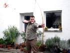 Steinzeitbogen, zwirnt die eigene Bogensehne und fertigt passende Pfeile