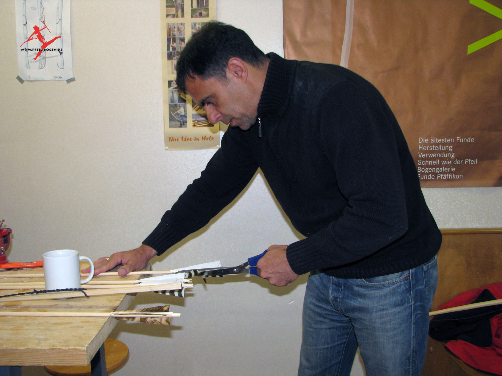 Steinzeitbogen, zwirnt die eigene Bogensehne und fertigt passende Pfeile