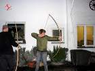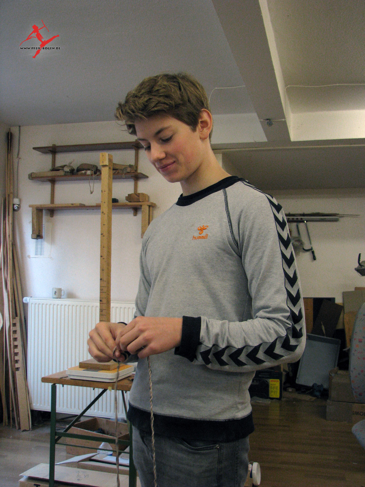 Steinzeitbogen, zwirnt die eigene Bogensehne und fertigt passende Pfeile