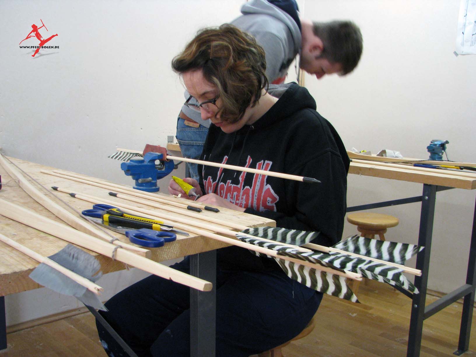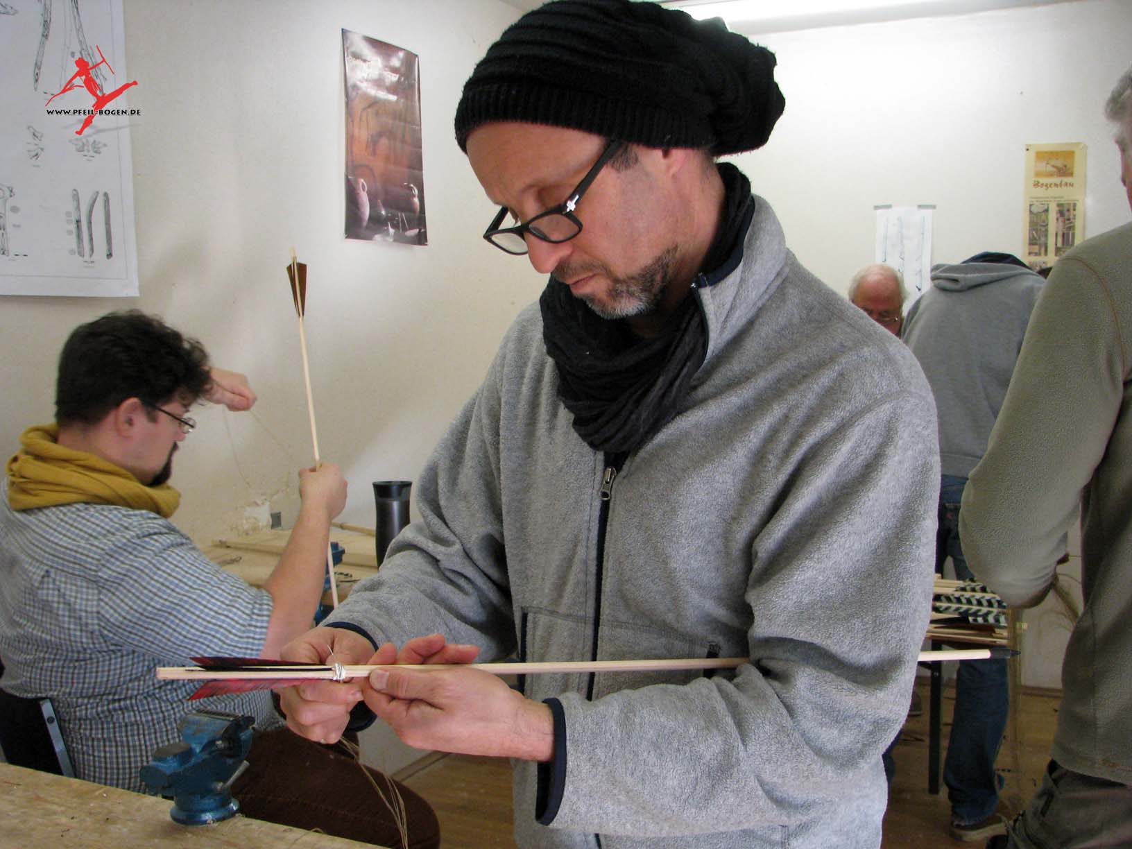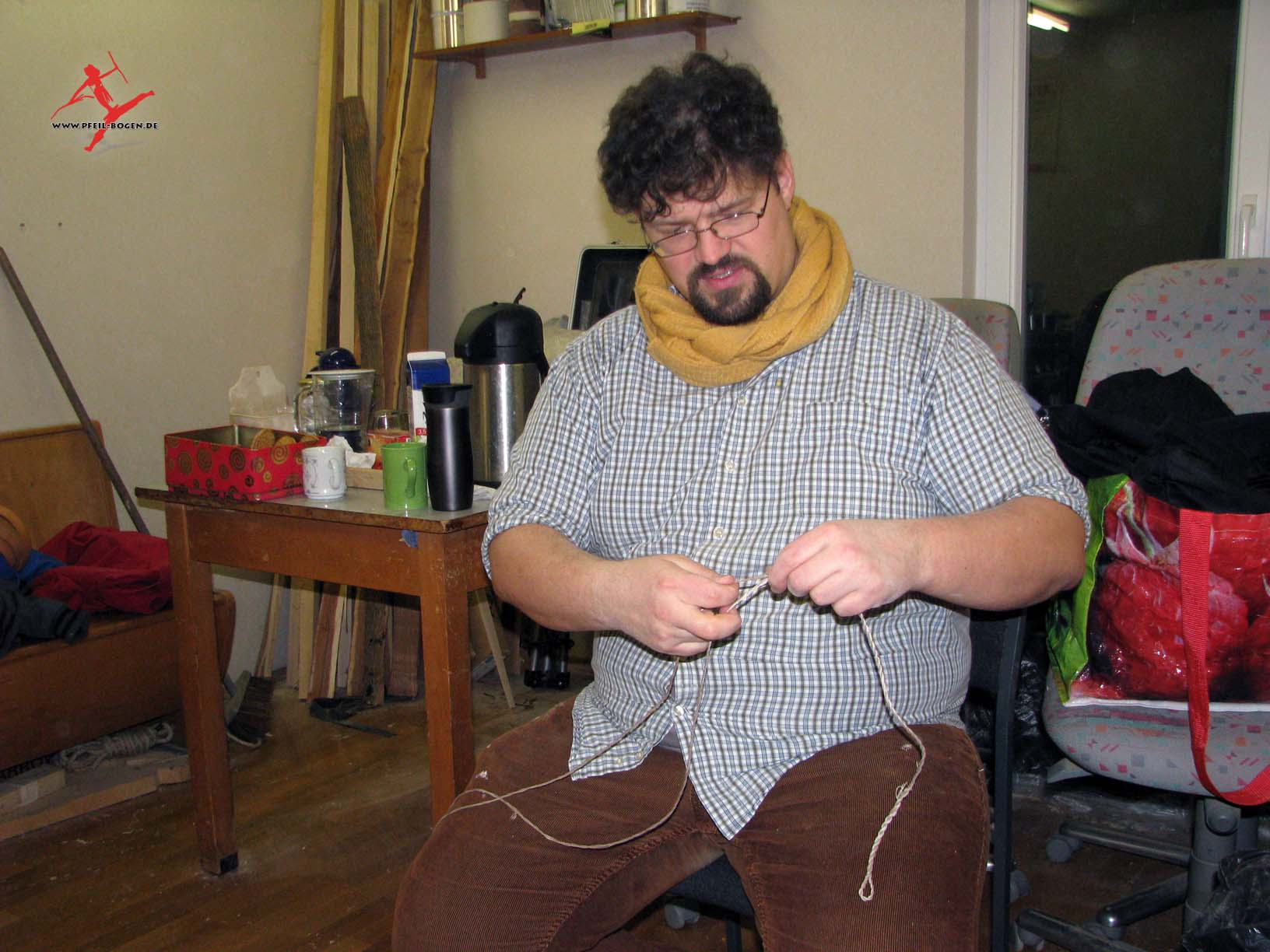 Steinzeitbogen, zwirnt die eigene Bogensehne und fertigt passende Pfeile
