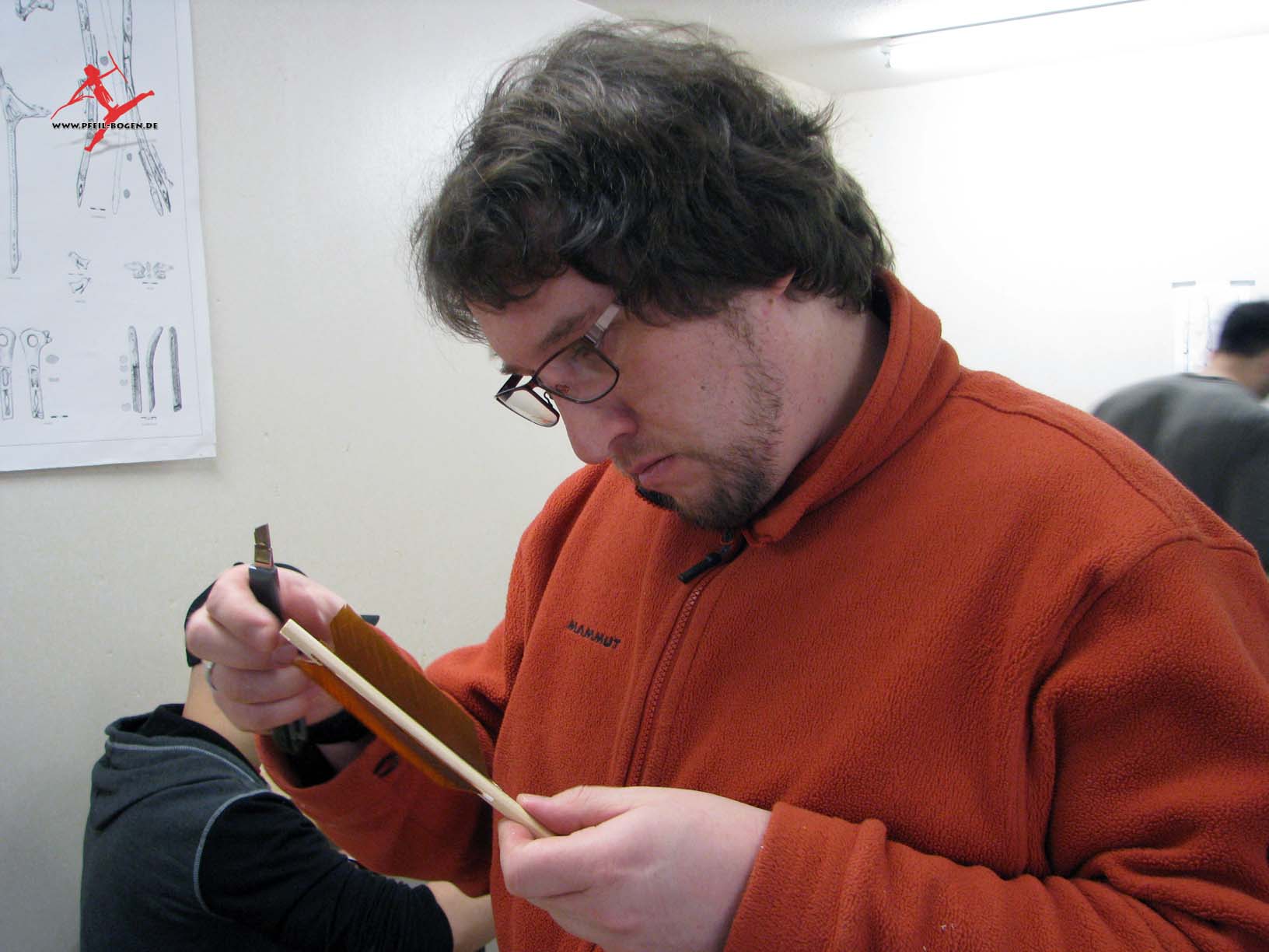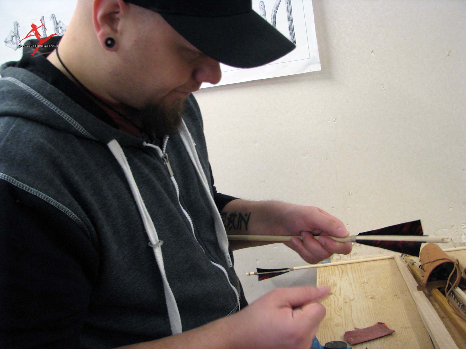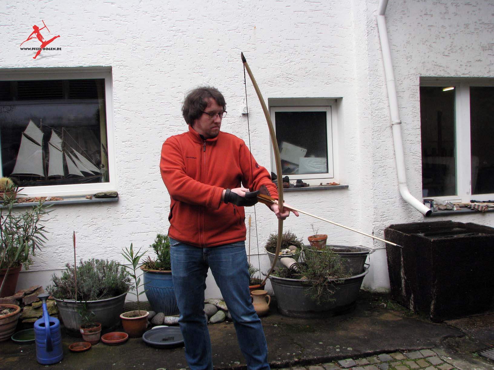 Steinzeitbogen, zwirnt die eigene Bogensehne und fertigt passende Pfeile