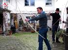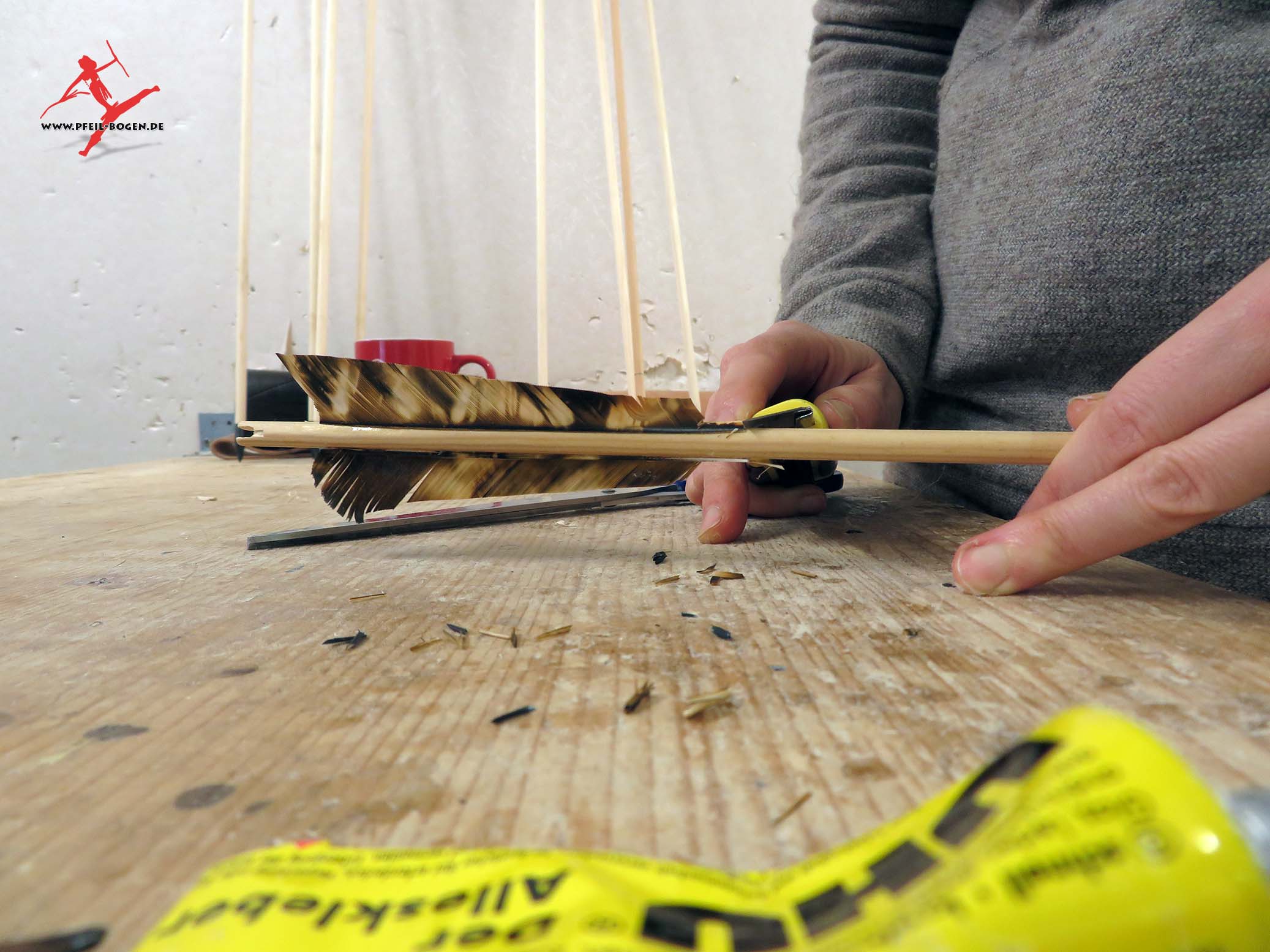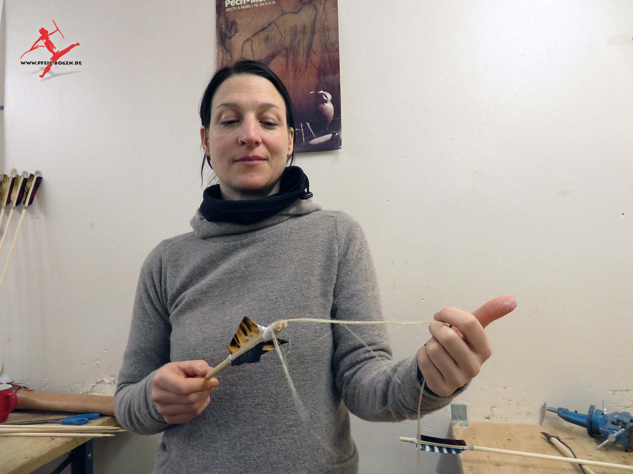 Steinzeitbogen, zwirnt die eigene Bogensehne und fertigt passende Pfeile
