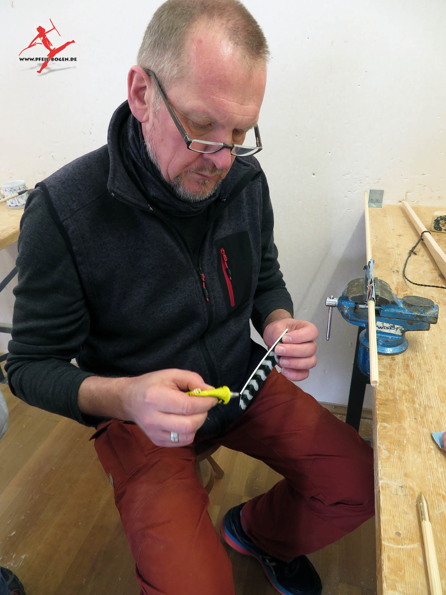 Steinzeitbogen, zwirnt die eigene Bogensehne und fertigt passende Pfeile